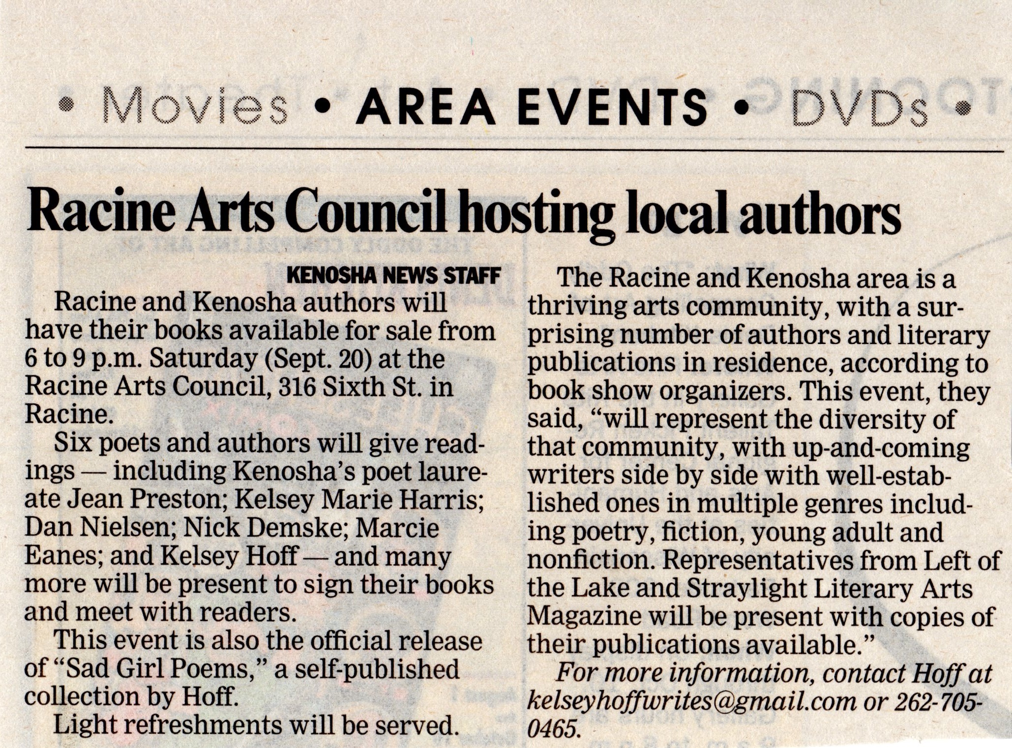Saturday September 20, about 15 authors came together for the Racine & Kenosha Authors Book Fair at the Racine Arts Council, which I organized. It was also the official release for my first chapbook Sad Girl Poems.